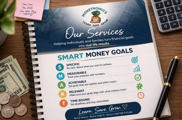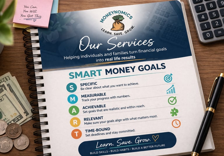 At Moneynomics, we help individuals and families turn financial goals into real life results. Through practical guidance and supportive coaching, you will learn how to manage your money, set meaningful goals, and make confident financial decisions.