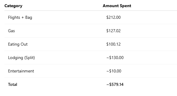 To do that, I broke my budget down by category—gas, food, lodging, flights, and fun—and tracked expenses daily to stay on course.